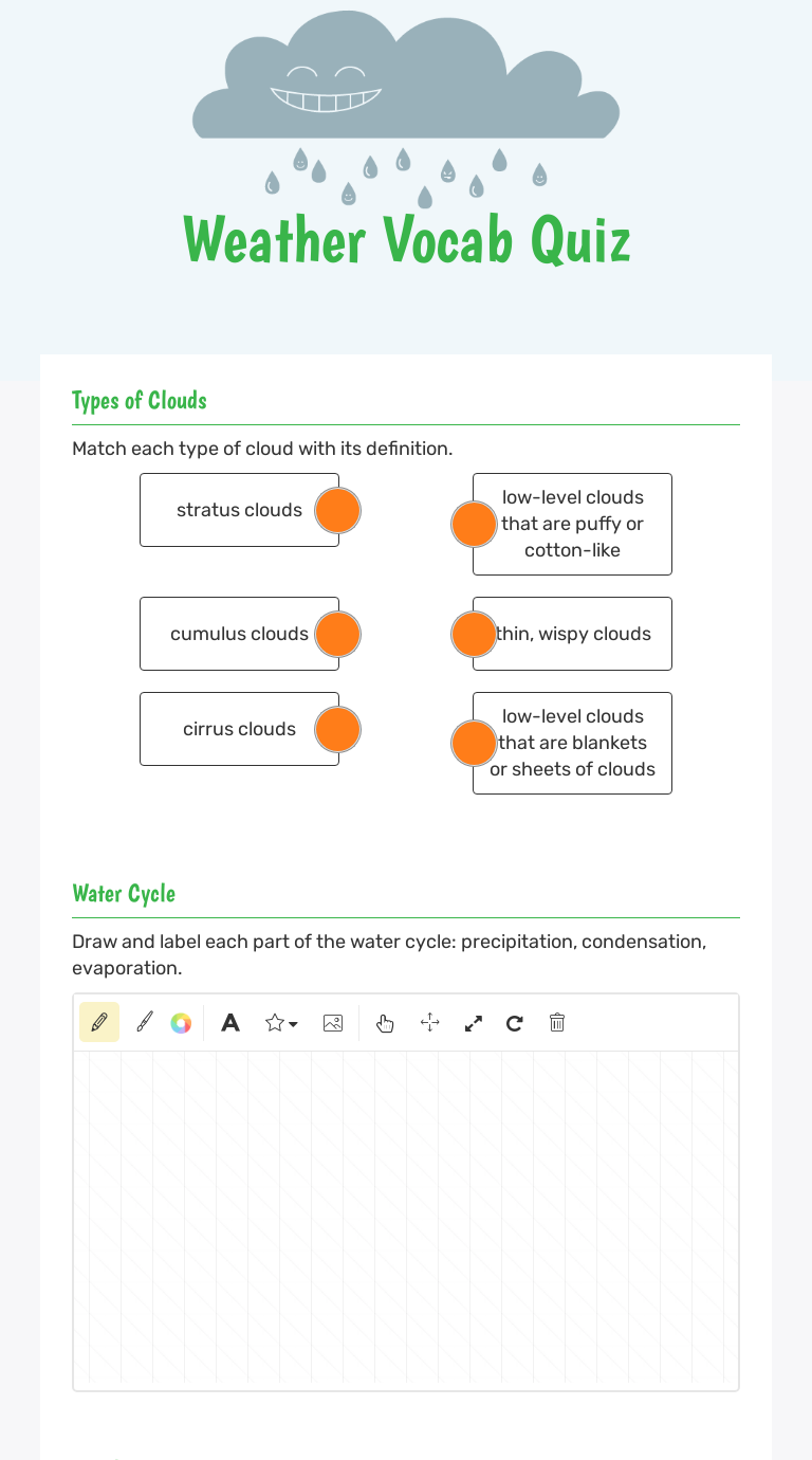 Weather Quiz Worksheets - K12 Workbook Weather Quiz Displaying all worksheets related to - Weather Quiz . Worksheets are Interpreting weather maps, Station model practice, Esl work weather, Sixth grade weather, Name types of clouds, Owlie skywarns tornadoes coloring book, Unit 2 weather, Name p eri od air masses and fronts.